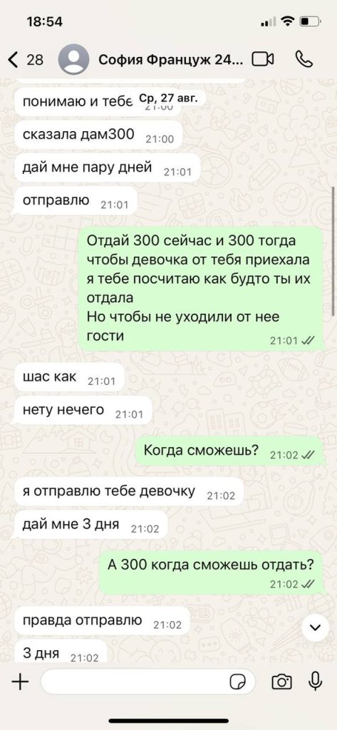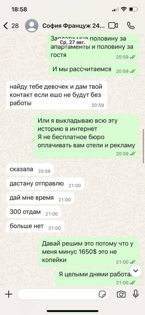 Договорились с Софией в тур, насчёт ее подруги сразу было отмечено что работы может не быть. Но подругу она решила взять за компанию (тк она ещё и не работала до этого). Кредитовалист апартаменты на сумму 750$ (на 4 дня) + реклама на каждую девочку