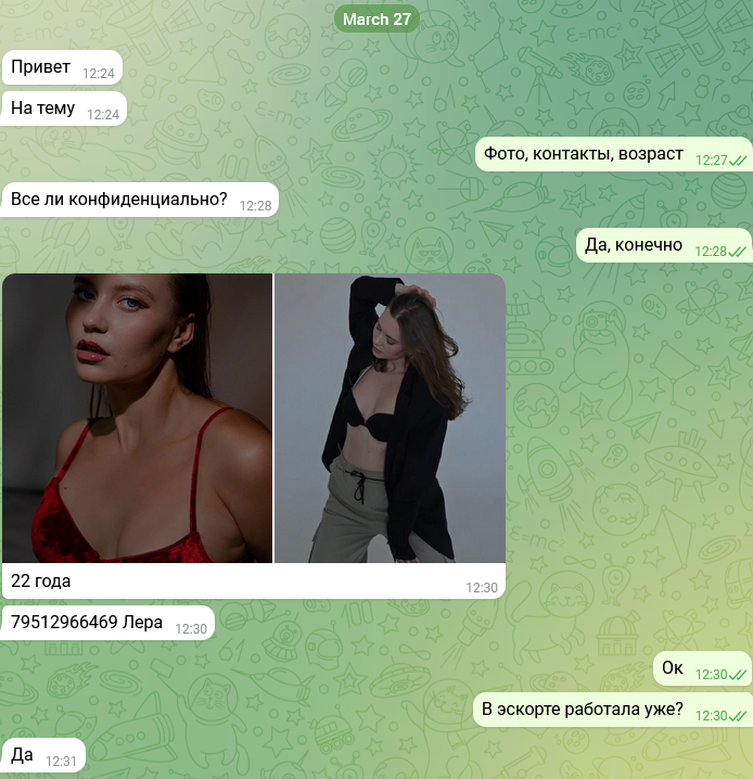 Эскортница из Кандалакши, приехавшая в Санкт-Петербург, решила подзаработать, участвуя в самых разнообразных встречах. Легко разделась на кастинге, чтобы попасть в эскорт, но процент агентству так и не вернула, и вскоре была слита. Недавно съездила за границу, где участвовала в МЖМ с двумя клиентами, рассчитывая на щедрые чаевые и приключения.