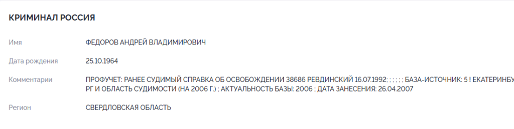 ФЕДОРОВ АНДРЕЙ ВЛАДИМИРОВИЧ 25.10.1964 – уголовник