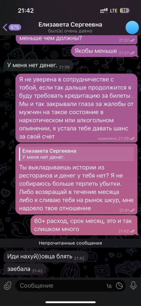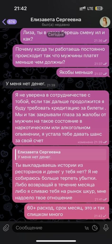 Проститутка из Москвы, работала в туре от агентства в Черногории, Грузии и собиралась заграницу, но к счастью раскрыла свое отношение к работе раньше. Общий долг, включая украденные деньги из кассы= порядка 800$. Агентство дало ей шанс, но она от него отказалась и тем самым дала согласие на размещение здесь. Лизу клиенты регулярно заставали в опьянённом состоянии, один из клиентов сказал, что в апартах в ванной у нее были шприцы, хотя изначально девушка была довольно милой, но видимо наркотики не щадят никого. Мужчины постоянно то отказывались от нее и не возвращались, то якобы “платили меньше”- сейчас нет возможности узнать, забирала ли она деньги в карман или действительно давали меньше из-за ее ужасного состояния. Переписки Лиза очень старательно подчистила, видимо думает что агентство ничего не сохранило)к сотрудничеству не рекомендуют данную девушку: спугнет всех ваших клиентов и обворует вас, как агентство.