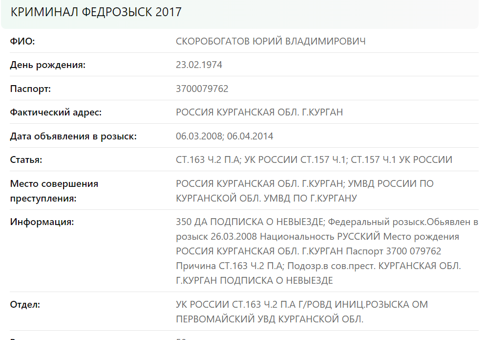 Отец – СКОРОБОГАТОВ ЮРИЙ ВЛАДИМИРОВИЧ 23.02.1974